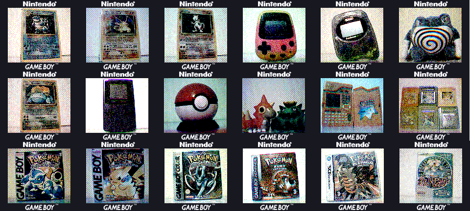 Here's a selection of photographs I took with my Game Boy Camera, using colour filters to create a colour image. In terms of object, I used lots of different Pokémon-related items, such as games, figures, and trading cards. Some came out better than others, but you can hopefully tell what was being photographed in each image.